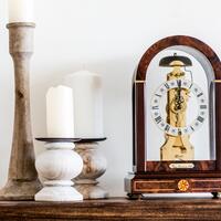Mehanički stolni sat s kućištem od masivnog drveta. Mehanizam ''Hermle'' Njemačka sa pogonom na ključ (14 dana).Otkucava jednom svaki puni sat.Orah završna obrada.